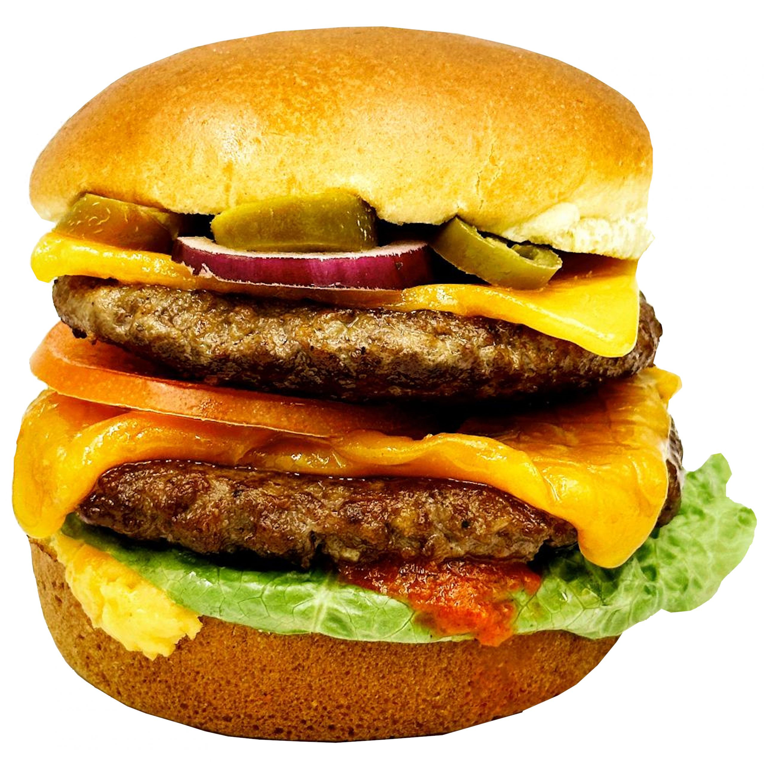 Dieser Burger besteht aus zwei saftigen 90-Gramm-Rinder-Patties, die mit Cheddar, fein