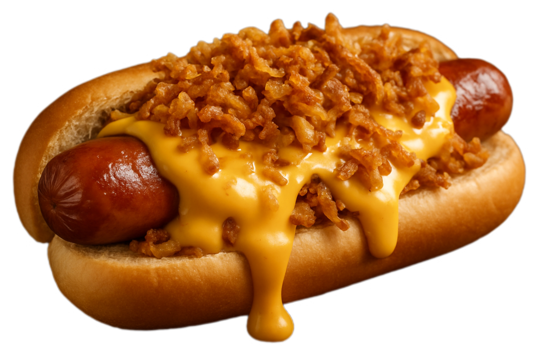 mit extra Käsesoße und gebratene Zwiebeln