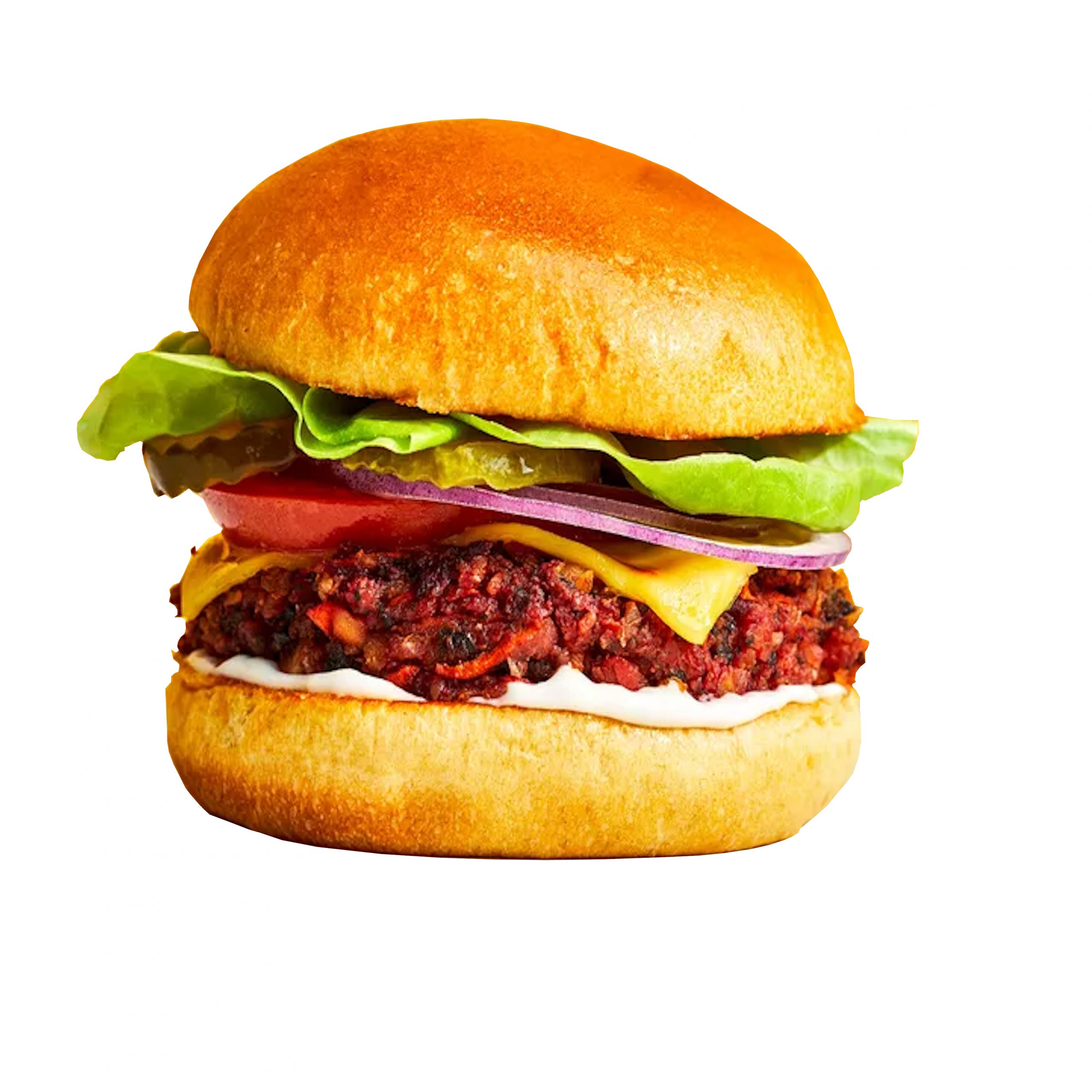 Entdecke unseren veganen Burger: ein 120 g veganes Patty, cremige Avocado-Mayo, knackige Salatherzen, saftige Tomaten, eingelegte Essiggurken, veganer Cheddar-Käse, frische Zwiebelringe und ein goldbraunes Brioche-Bun. Ein Geschmackserlebnis, das dich garantiert heiß auf mehr macht!